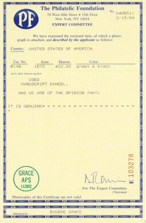 Due to the high cost of obtaining certificates we will only refund the cost of the stamp and not the cost of the certificate for stamps that sell for less than $250 that come back with a negative certificate. Stamps that sell for above $250 will receive a full refund for both the price of the stamp and cost of the certificate if it should come back not as described. For U.S. stamps only certificates from either APS, PSE or from the Philatelic Foundation are accepted, however "graded" certificates or "encased" items are not accepted.