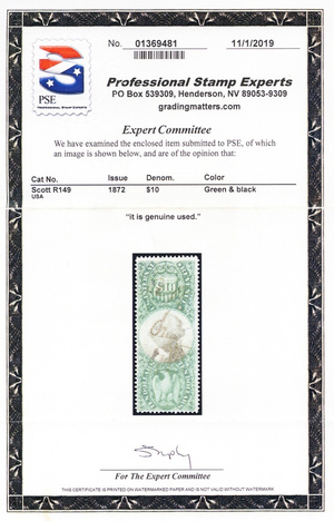 R149, Used VF $10 Scarce Revenue Stamp PSE Cert SCV $400 - Stuart Katz