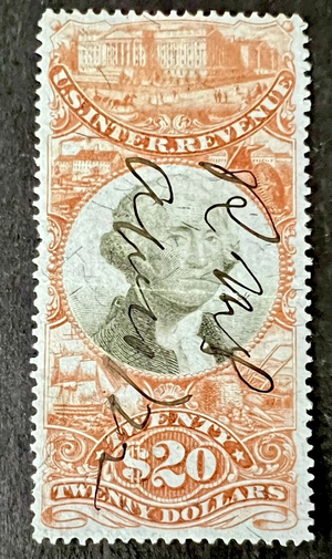 Fantastic high-value Third Issue U.S. Documentary Revenue #R150 in Orange & black on silk paper, ms. ccl. (April / 72), faint horiz. crease, rich color, well-centered, used, issued by Jos. Carpenter, Philadelphia, PA in 1871-72.