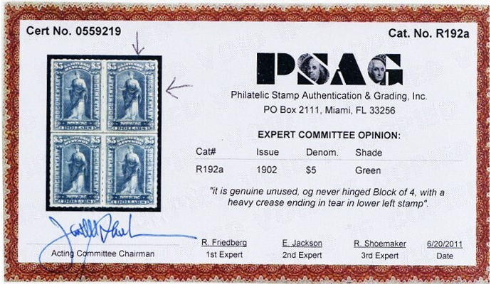 R192, Mint VF NH $5 Revenue Stamp With PSAG Certificate - Stuart Katz