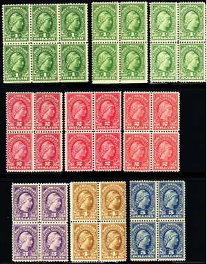 Group of nine "Liberty" Dollar-Value blocks (Scott R219//R257), comprises R219 (block of 4, couple minor faults), R240 (2 NH blocks of 4, one with top straight edge), R241 (3 NH blocks of 4), R243 (NH block of 4), R244 (NH block of 4), and R257 (bottom straight edge block of 6, 4 stamps NH - 3 of them straight edge), Fine to Very Fine.