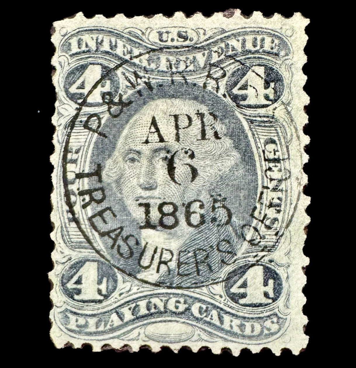 Fantastic Sock-on-Nose #R21c 4¢ Playing Cards, deep slate, First Issue U.S. Revenue,