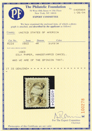 Due to the high cost of obtaining certificates we will only refund the cost of the stamp and not the cost of the certificate for stamps that sell for less than $250 that come back with a negative certificate. Stamps that sell for above $250 will receive a full refund for both the price of the stamp and cost of the certificate if it should come back not as described. For U.S. stamps only certificates from either APS, PSE or from the Philatelic Foundation are accepted, however "graded" certificates or "encased" items are not accepted.