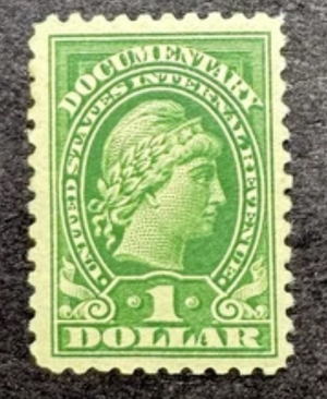 #R257, $1 green, unused, OG, a few gum skips, doesn’t detract. Perforated 10, engraved, 1928-29 Revenue Series. Excellent impression, color, centering, condition.