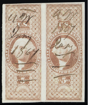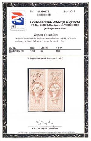 R88a, Used $5 Scarce Imperforate Revenue Pair PSE Cert SCV $750 - Stuart Katz