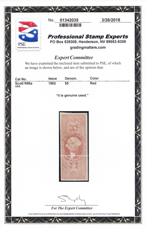 Due to the high cost of obtaining certificates we will only refund the cost of the stamp and not the cost of the certificate for stamps that sell for less than $250 that come back with a negative certificate. Stamps that sell for above $250 will receive a full refund for both the price of the stamp and cost of the certificate if it should come back not as described. For U.S. stamps only certificates from either APS, PSE or from the Philatelic Foundation are accepted, however "graded" certificates or "encased" items are not accepted.