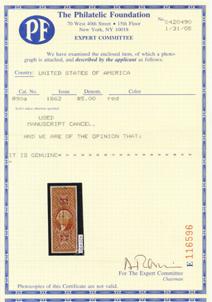 Due to the high cost of obtaining certificates we will only refund the cost of the stamp and not the cost of the certificate for stamps that sell for less than $250 that come back with a negative certificate. Stamps that sell for above $250 will receive a full refund for both the price of the stamp and cost of the certificate if it should come back not as described. For U.S. stamps only certificates from either APS, PSE or from the Philatelic Foundation are accepted, however "graded" certificates or "encased" items are not accepted.