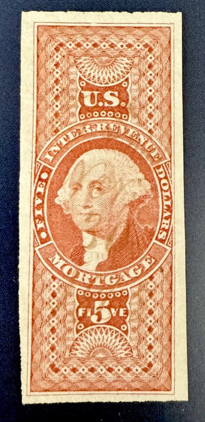 | Fantastic #R91a Extremely Fine, large margins, quite fresh $5 Mortgage First Issue Revenue, imperforate, very light manuscript cancel. A real nice looking stamp.