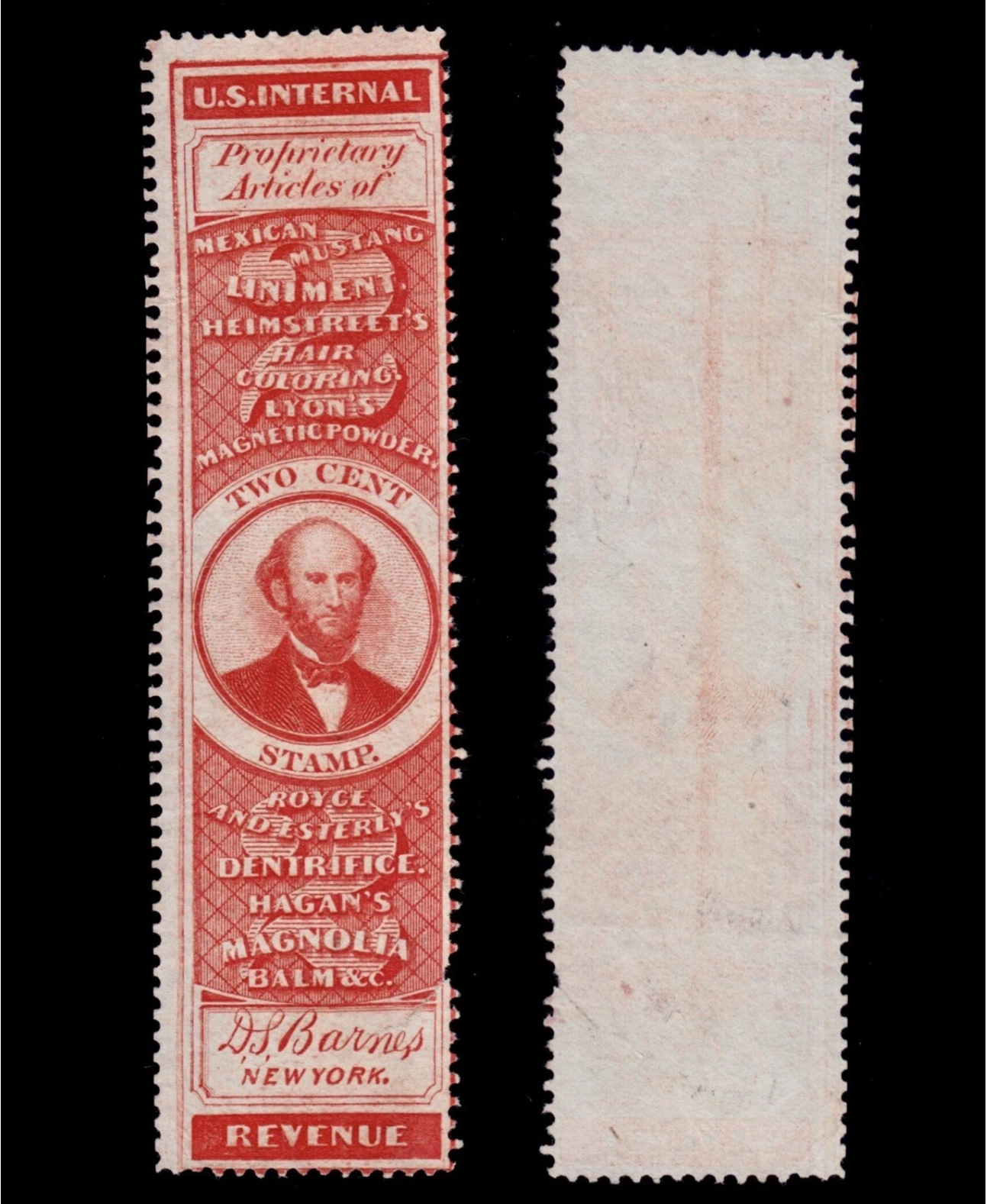 Note: Private Die Proprietary Revenue stamps were usually torn in opening the box or container. Values quoted in Scott are for F/VF examples that may be somewhat faulty but reasonably attractive, with a faults usually not readily apparent on the face.