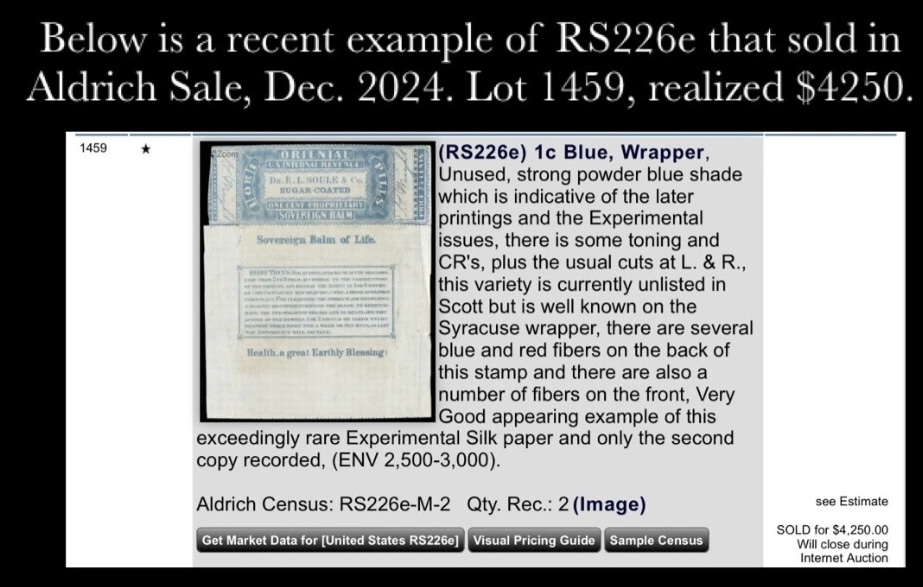 Third known example of the exceedingly rare #RS226e 1¢ strong powder blue shade of Dr. E.L. Soule & Co. wrapper, used (slits at L & R) on Experimental Silk paper, with embedded short blue & red silk fibers on front & back, unlisted in Scott.
