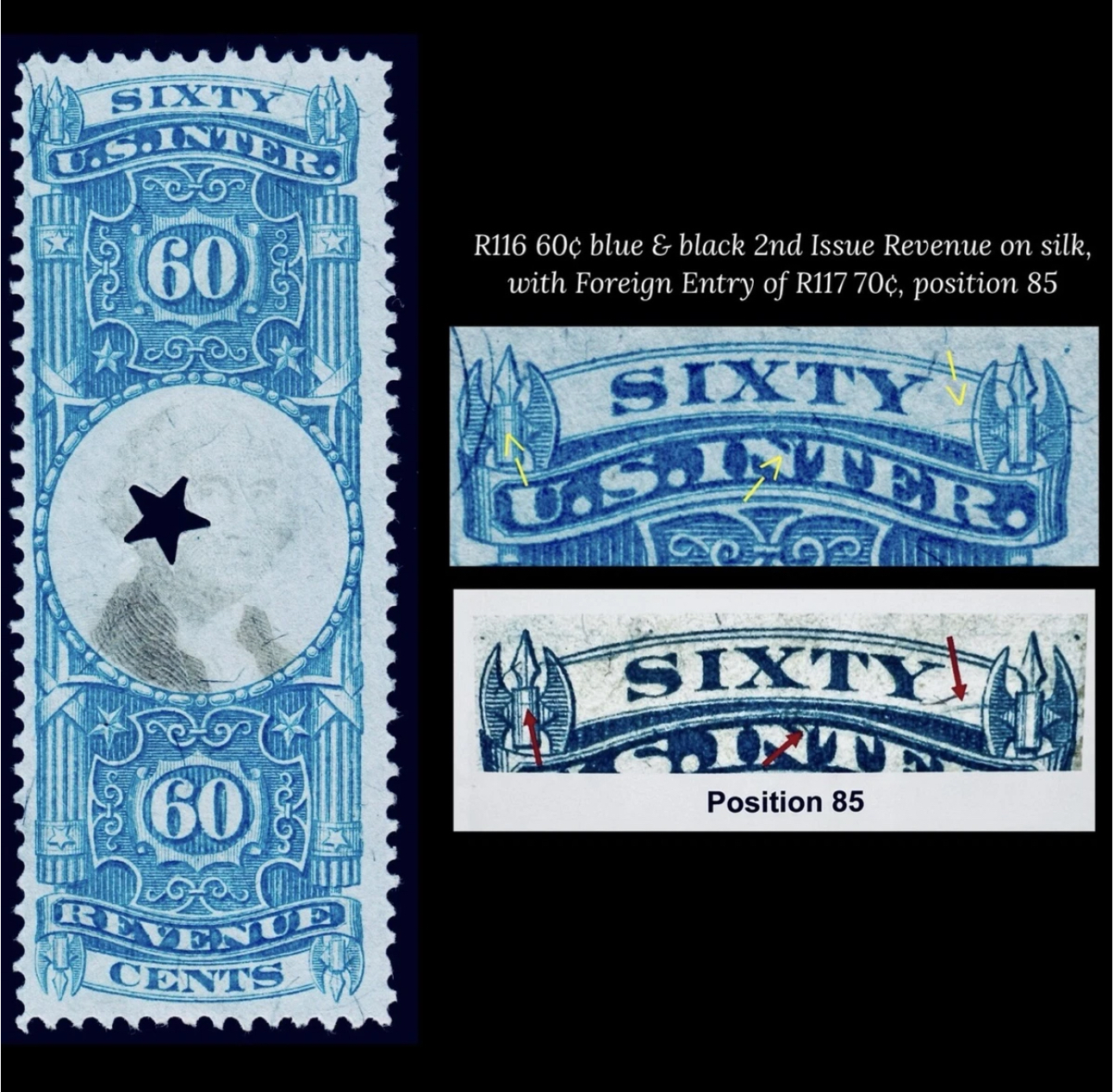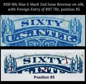 Scarce Foreign Entry of 2nd Issue 1871 Documentary Revenue #R117 70¢ black & blue on the #R116 60¢ black & blue on silk paper.