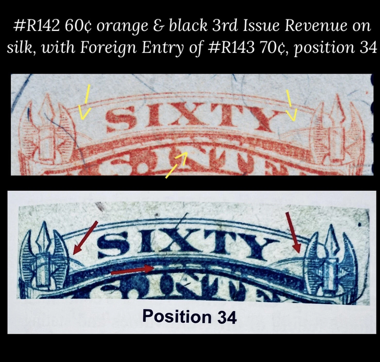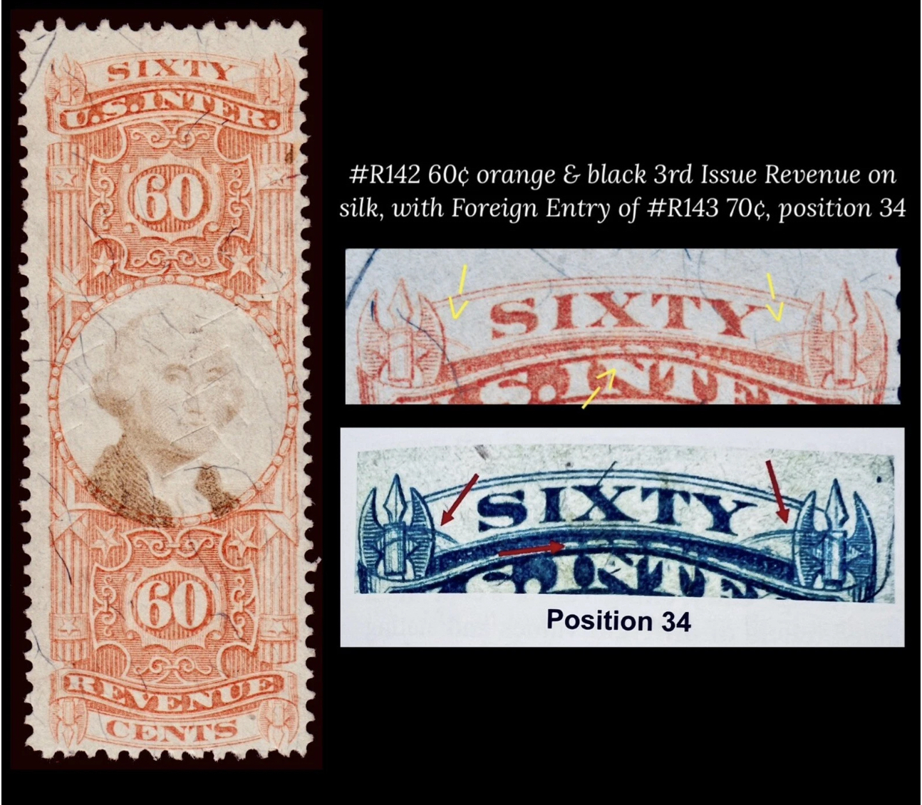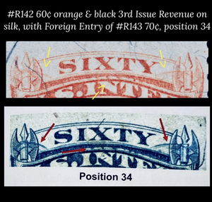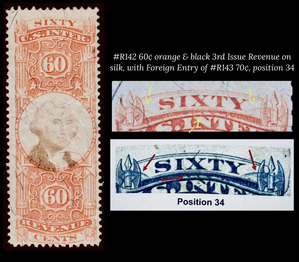 Scarce Foreign Entry of 3rd Issue 1871-72 Documentary Revenue #R143 70¢ on the #R142 60¢ orange & black on silk paper.