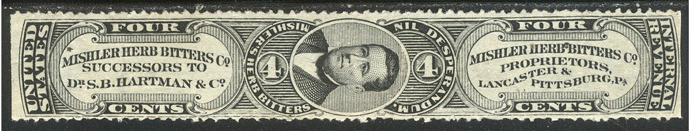 Scott #RS181p: 4c Black, Mishler Herb Bitters Centering & Condition: Unused. Very Fine and SCARCE. Reverse (Gum Side): Without gum Faults / Imperfections: Couple small thins The item pictured is the actual item you are purchasing, unless otherwise noted. I also offer an interest-free layaway plan. Ask me about it!" All items will be mailed a day or two after payment is received. --------------------------------------------------------------------------------