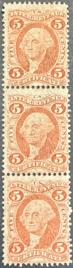 US Scott R24c — 1862 5¢ Certificate Revenue — Used Strip of Three