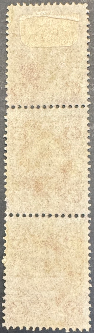 This listing is for a used vertical strip of three U.S. First Issue revenue stamps, Scott R24c, issued in the 1860s during the Civil War period. The stamps feature George Washington in the orange-brown shade.