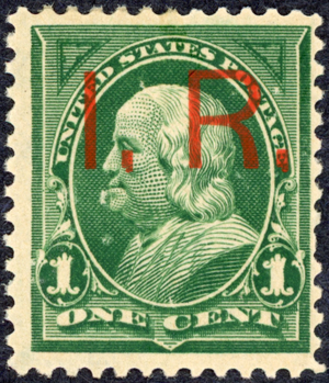 Genuine 1914 Emergency Issue 1¢ Green Benjamin Franklin Documentary Revenue stamp with red “I.R.” overprint.