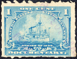 Offered is an authentic 1914 Issue 1¢ Blue Documentary Revenue stamp featuring the classic battleship design.