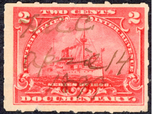 Offered is a genuine 1914 Issue 2¢ Red Documentary Revenue stamp featuring the classic battleship design.