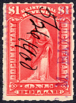 $1.00 denomination from the 1914 issue. Stamp is USED with visible manuscript pen cancellation. No gum present, as expected for used revenue material.