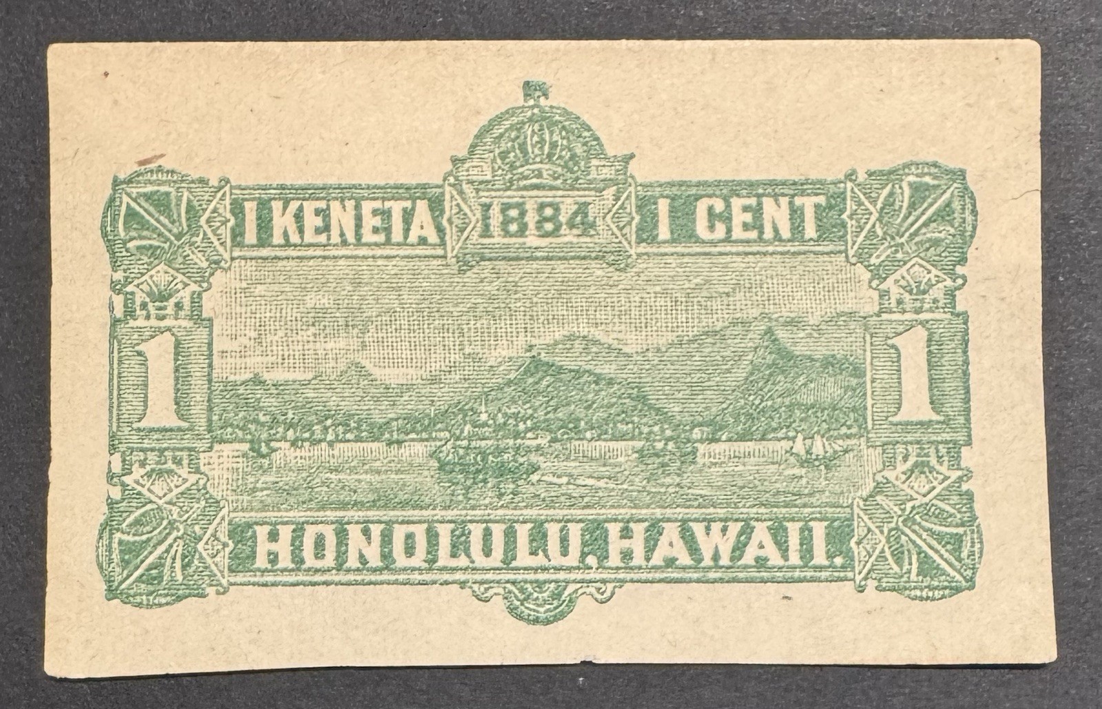 Original 1884 Hawaii 1¢ Green Envelope (U1b) from the Hawaiian Kingdom period. This is the front panel with attached original back flap, featuring the classic engraved Honolulu harbor view, “I Keneta – 1884 – I Cent,” and ornate royal crest and Hawaiian flags.