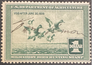 This is an authentic 1937 RW4 $1 Federal Migratory Bird Hunting Stamp, the fourth duck stamp issued by the U.S. Department of Agriculture. Features the classic “Canada Geese Coming In” design by J.N. “Ding” Darling.