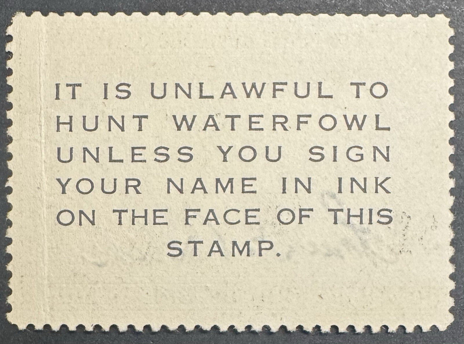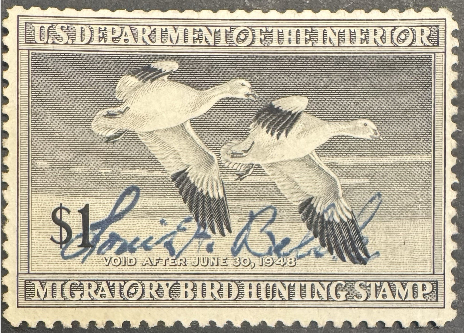 This is an authentic 1947 RW14 $1 Migratory Bird Hunting Stamp, featuring Walter Weber’s classic “Snow Geese” design. This Federal Duck Stamp was required for waterfowl hunters and properly bears the hunter’s signature, as mandated by law.