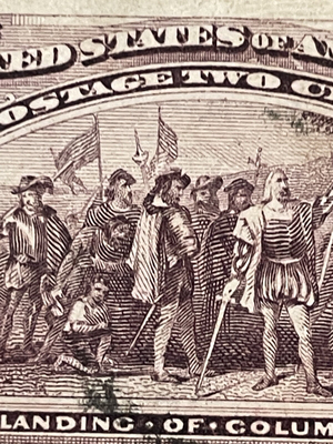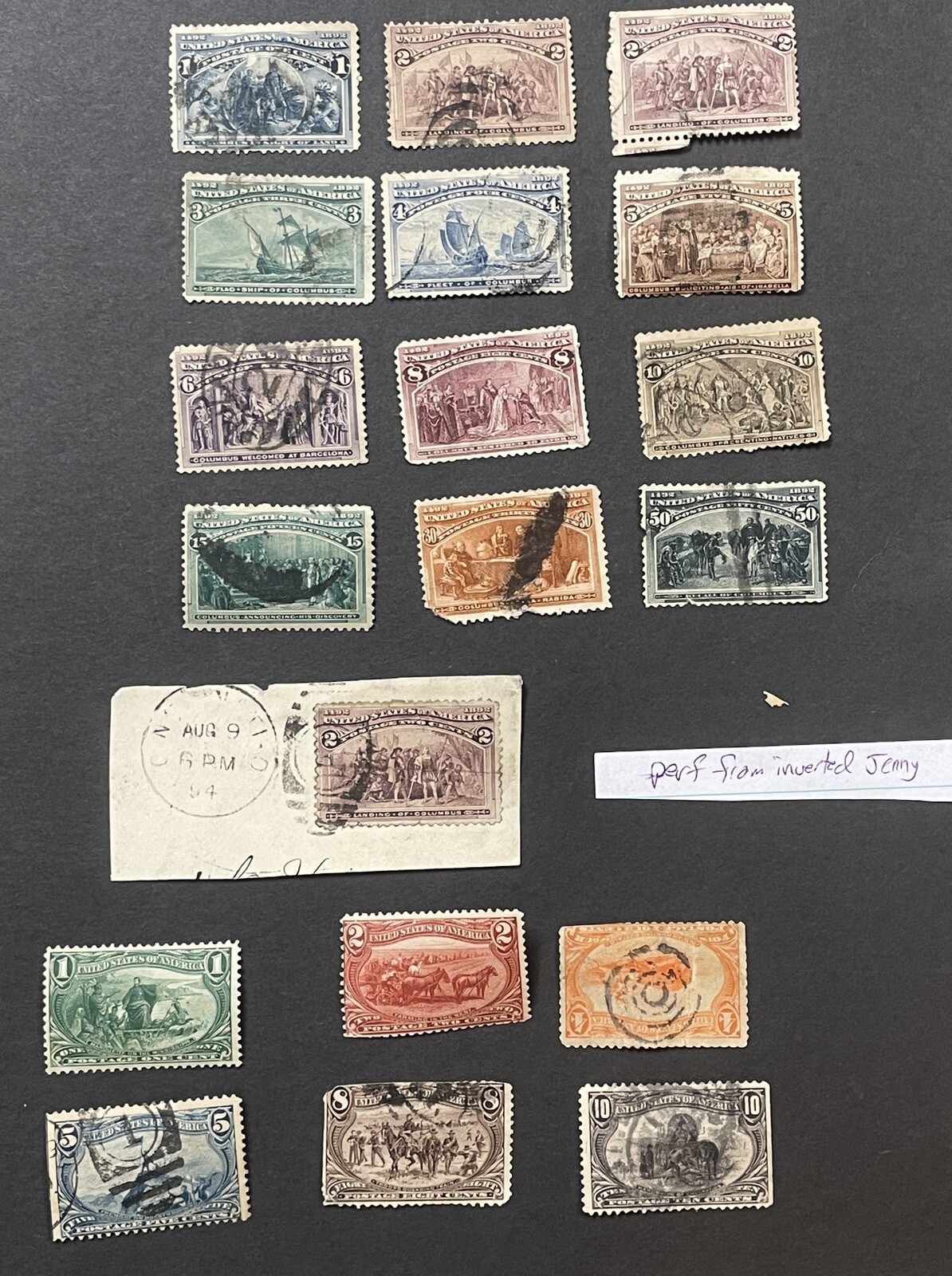 Columbians 230, 231, 231 broken hat, 232, 233, 234, 235, 236, 237, 238, 239 (missing bottom left corner), 240 (faults as shown from back), 230 on piece, Trans- Mississippi: 285 (mnh), 286 (mnh), 287 (space filler. Not valued in selling price), 288 (space filler, not valued in price), and 289.