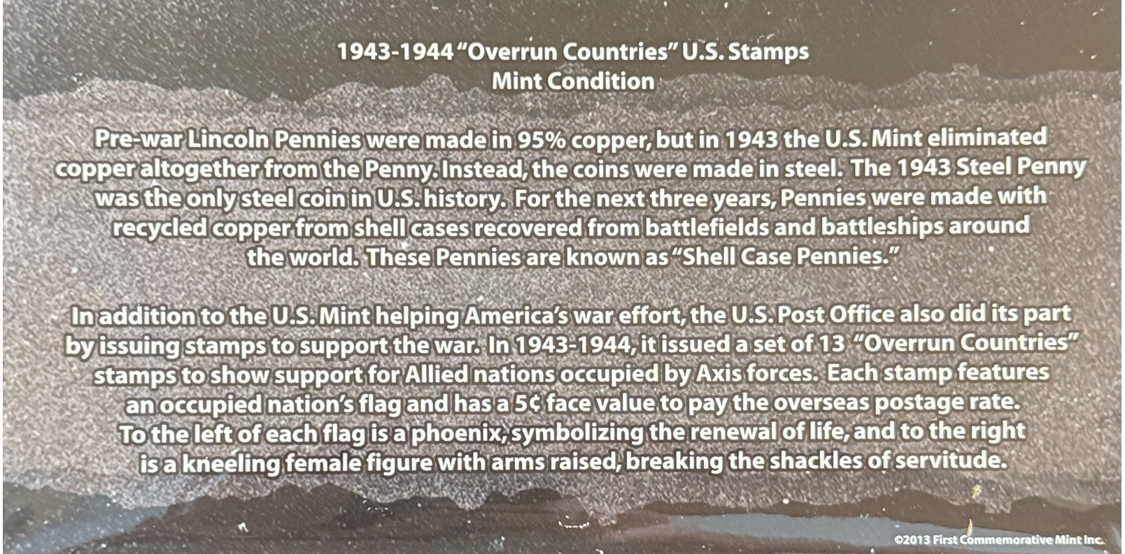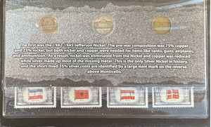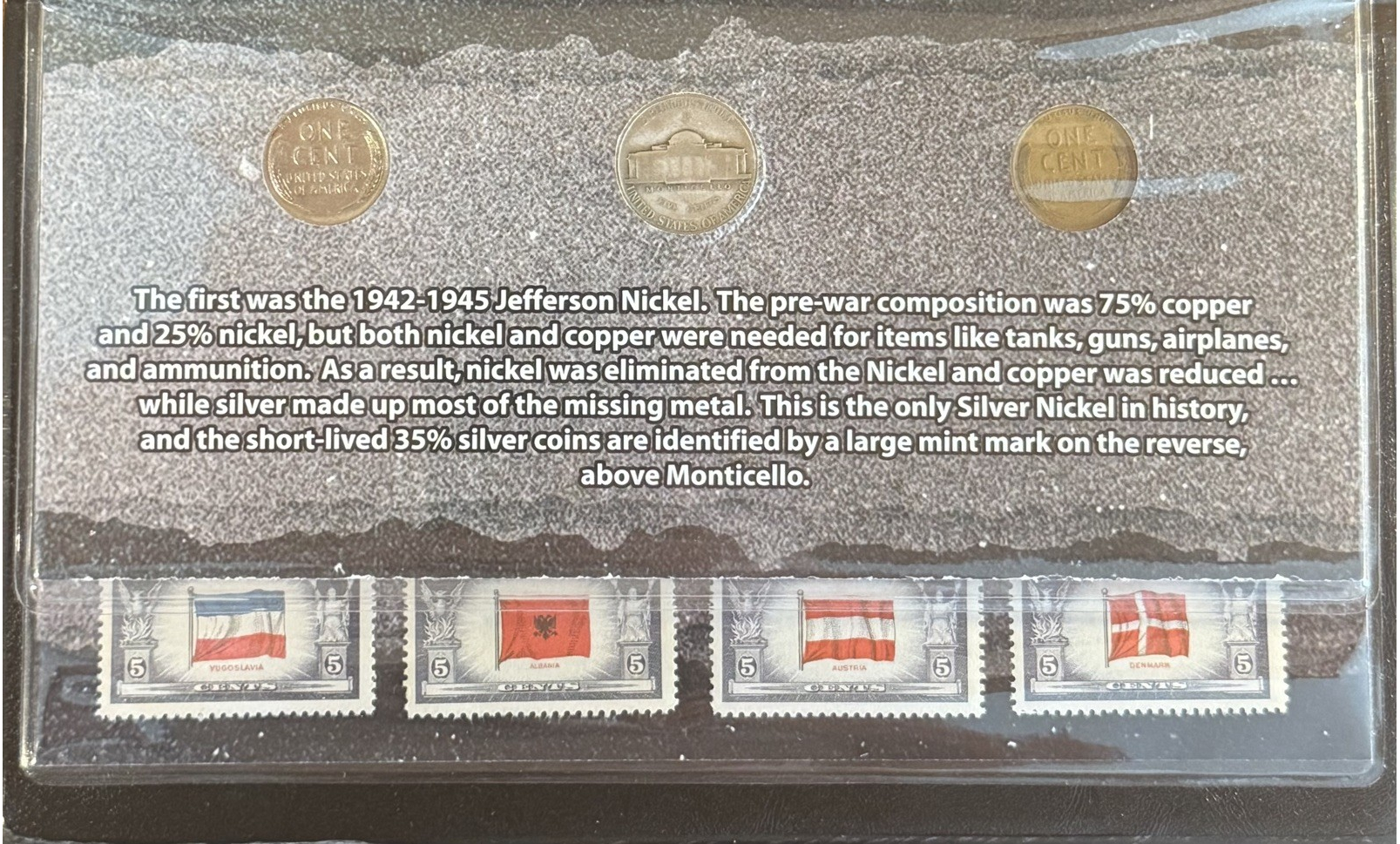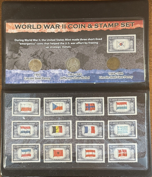 The World War 2 US Coin & Stamp Set includes a Steel Wheat Penny and a Silver Jefferson Nickel, both from the years 1941-1950. These coins are a unique piece of history from the United States during the World War II era, showcasing the various designs and materials used during this time. The set also comes in an album for easy display and preservation, making it a valuable addition to any numismatist or history enthusiast's collection.