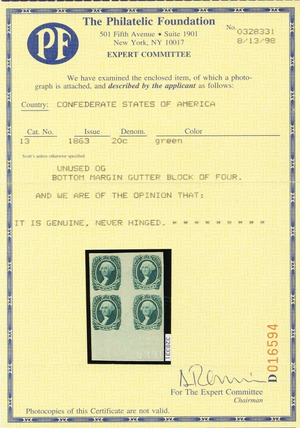 Due to the high cost of obtaining certificates we will only refund the cost of the stamp and not the cost of the certificate for stamps that sell for less than $250 that come back with a negative certificate. Stamps that sell for above $250 will receive a full refund for both the price of the stamp and cost of the certificate if it should come back not as described. For U.S. stamps only certificates from either APS, PSE or from the Philatelic Foundation are accepted, however "graded" certificates or "encased" items are not accepted.