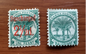 The product is a set of two Samoa stamps featuring palm trees, with denominations of 1/2p and 2 1/2p. The stamps are from the years 1891-1900, in mint hinged quality, and in green color. This collectible item captures the theme of trees in a unique and historical context, making it a valuable addition to any stamp collection.
