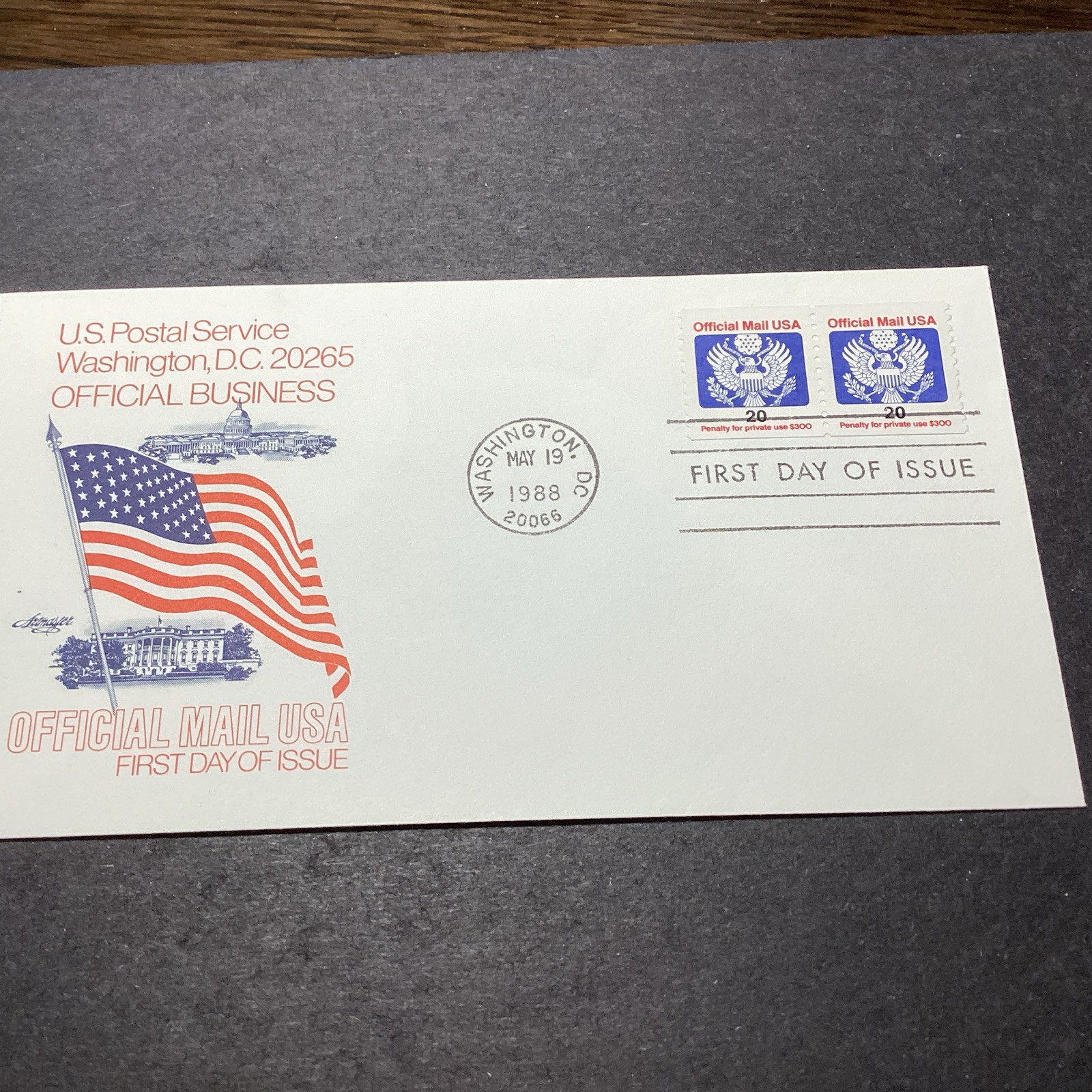 1988-Official Mail 20c-#O138b-coil pair with Artmaster FDC flag, eagle & shield. Shipped with USPS Ground Advantage.