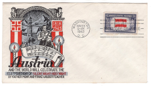 | US #919 5c AUSTRIA OVERRUN COUNTRY FDC-Ludwig STAEHLE CACHET-SILENT NIGHT CACHET-FRESH-UNSEALED! Beautiful Ludwig Staehle Cachet on this FDC for Scott #919 the 5c Austria National Flag from the Overrun Nations issue of 1943. Envelope is unsealed with gum on flap. Cachet commemorates the 125th anniversary of the song Silent Night by Father Mohr and Franz Gruber-Teacher. Very clean cover since it was very carefully stored for over 70 years in a collection. For the collector who wants nothing but the best in their collection. The scans show it all. I am an APS Dealer-member 105953-D in business since 1973 specializing in Pre-1945 US Stamps. Domestic postage $1.00 per item. Florida Residents pay sales tax of 7.0% |