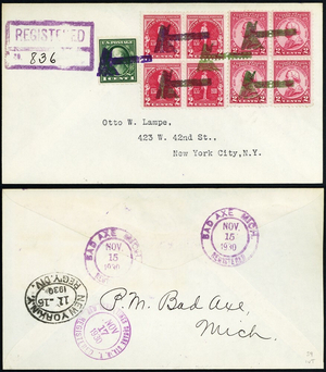 [Michigan] Bad Axe, Axe in bright green, six nice strikes, four in green and one each in purple and black, tie 17¢ postage on a Nov 15, 1930 Registered cover to Otto W. Lampe in New York, Very Fine. Designed by Willis F. Cheney. Used on only about 50 covers.