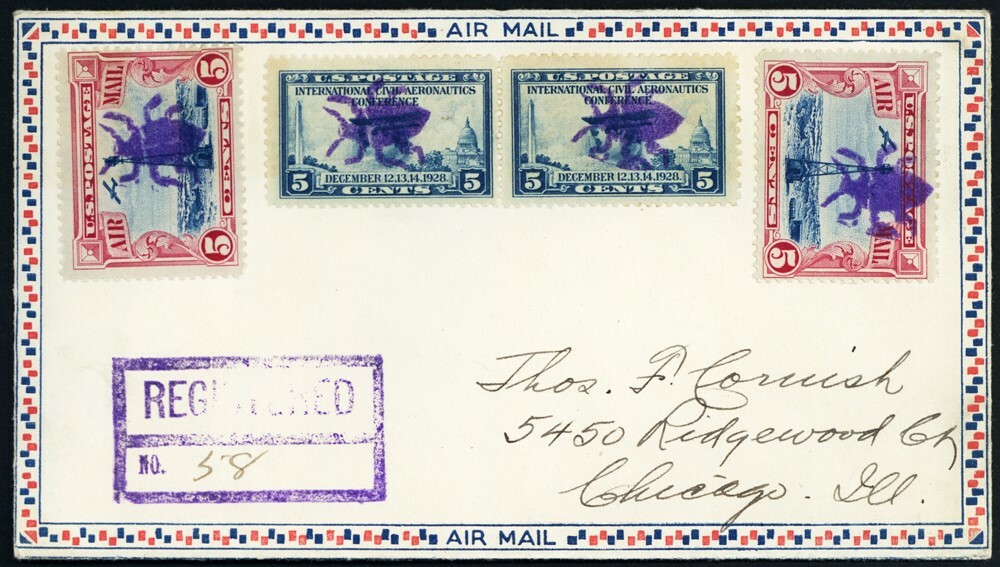 [Kentucky] Bug, Beetle in purple, four perfect strikes cancel two 5¢ Aeronautics Conference & two 5¢ Beaconss on a Nov 1, 1929 Registered Airmail cover to Thomas Cornish in Chicago; small flap tear, Very Fine. Designed by C.A. Paige.