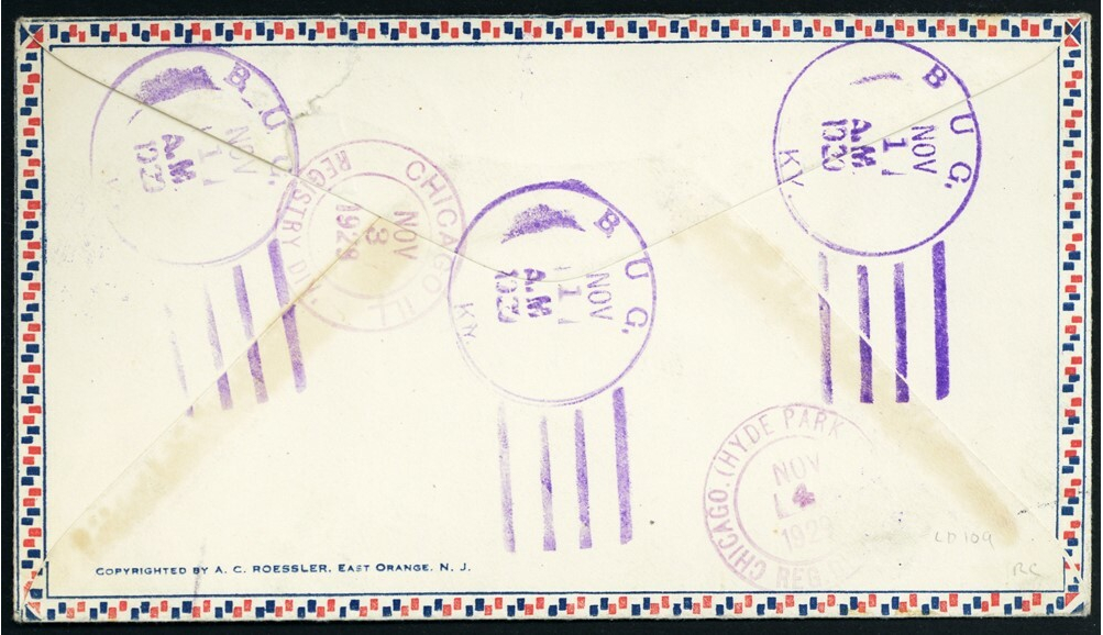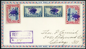 | [Kentucky] Bug, Beetle in purple, four perfect strikes cancel two 5¢ Aeronautics Conference & two 5¢ Beaconss on a Nov 1, 1929 Registered Airmail cover to Thomas Cornish in Chicago; small flap tear, Very Fine. Designed by C.A. Paige. Stuart Katz Do not hesitate to ask me with any questions that you may have. About Me I have been a full time stamp & coin dealer for the past 45 years. Member of the ANA, ASDA, NGC and dealer member of the American Philatelic Society