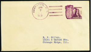 [New York] Beerton, Mug of Beer in purple, Very Fine strike, with a matching Apr 7, 1933 duplex handstamp alongside, ties a 3ยข Oglethorpe commemorative on a cover to R.P. Gilley in Chicago Ridge, Ill., Very Fine. The first day of use.