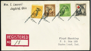 [Ohio] Jaybird, Blue Jay, four Very Fine strikes tie 17¢ postage on a Sep 30, 1931 Registered cover to Floyd Shockley in Cumberland, Ind., Very Fine. The only recorded date of use, but not noted in black. Loso-deWindt 590.