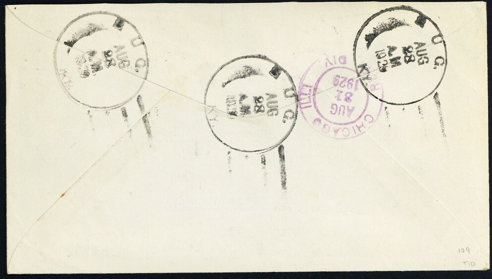 [Kentucky] Bug, Beetle, four strikes and a light Aug 28, 1929 c.d.s. cancel 17¢ postage on a Registered cover to Chicago, Fine to Very Fine. Three days prior to the Loso & deWindt earliest date of use.