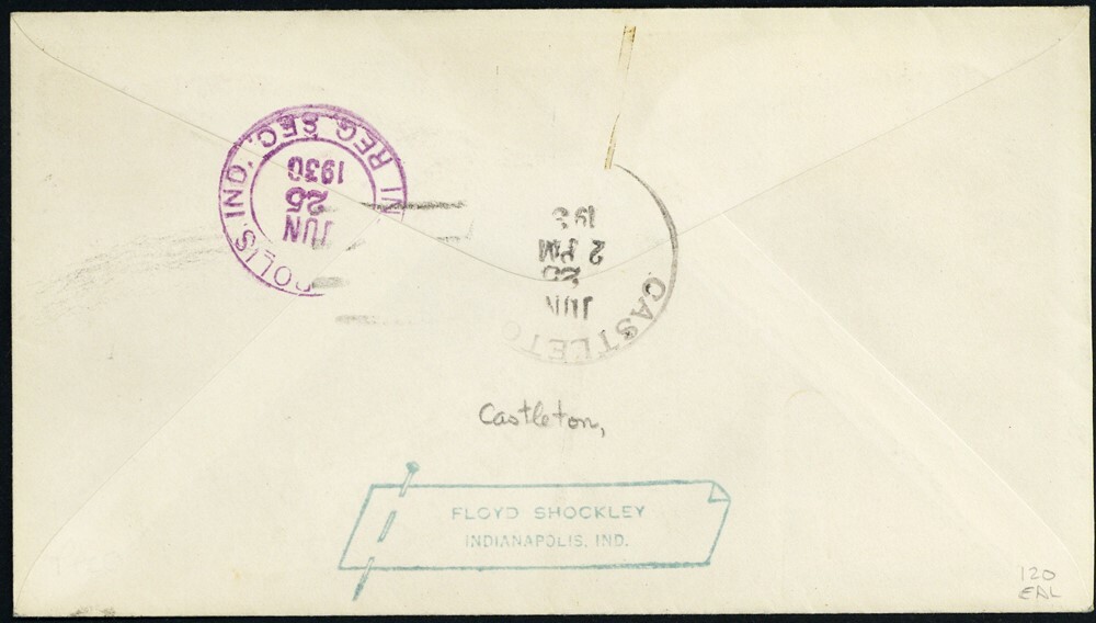 [Indiana] Castleton, negative boxed Castle in purple, five Very Fine strikes (inverted) tie 17¢ postage on a Jun 25, 1930 Registered cover to Floyd Shockley in Indianapolis, Very Fine. Loso-deWindt 120.
