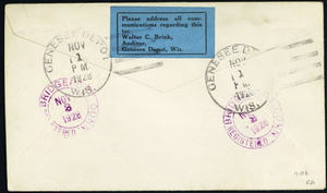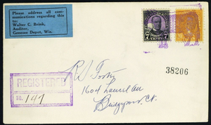 [Wisconsin] Genesee Depot, Cow in purple, clear strike ties 17¢ postage on a Nov 1, 1928 Registered cover from the cancel's designer, Walter. C. Brink, to Bridgeport, Ct., Very Fine.