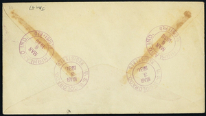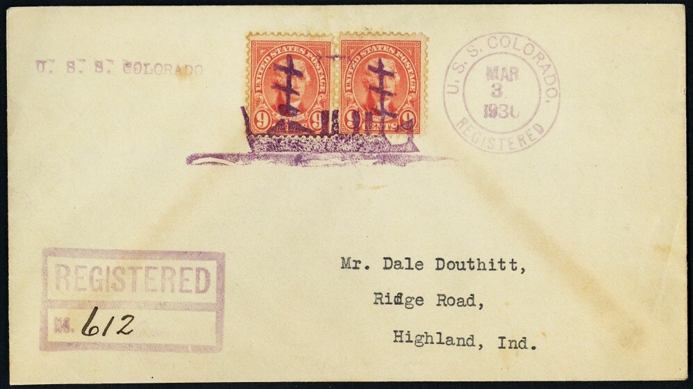 [Navy Ship] Destroyer U.S.S. Colorado Ship silhouette in violet, clear strike, with a matching Mar 3, 1930 Colorado c.d.s. alongside, ties a 18¢ postage on a Registered cover to Highland, Ind., Fine to Very Fine. Loso-deWindt Unlisted.
