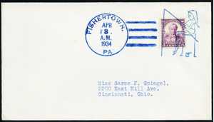 [Pennsylvania] Fishertown, Elf Fisherman on a Tree Stump in blue, choice strike, with a matching Apr 3, 1934 duplex handstamp alongside, ties a 3ยข Daniel Webster on a cover to Cincinnati, Very Fine. Only noted on Mar 28, 1934.