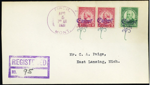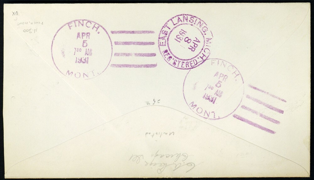 [Montana], Finch, "Easter" & Lily in purple & green, three choice strikes, with an Easter Sunday, Apr 5, 1931 c.d.s. alongside, tie 17¢ postage on Registered cover from.A. Paige to himself in East Lansing, Mich., Very Fine.