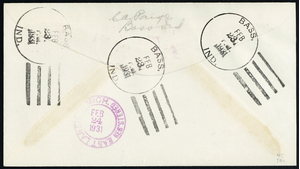 [Indiana] Bass, George Washington bust in purple, three Very Fine strikes tie 17¢ postage on a Feb 23, 1931 Registered cover from C.A. Paige to himself in East Lansing, Mich., Very Fine. Previously thought to have been used only on Washington's Birthday, Feb 22. Loso-deWindt 45.