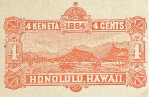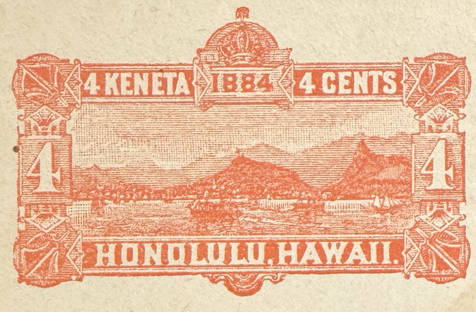This listing is for an original 1884 Hawaii 4¢ “4 Keneta / 4 Cents” cut square from the postal entire Scott U7. This is the front panel only (not a full envelope), showing the iconic Honolulu Harbor and Diamond Head design printed in carmine-orange on thin wove envelope paper.