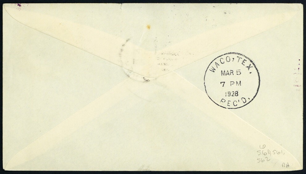 [Texas] Houston, "HOUSTON/TEX." in blue, five Very Fine strikes tie five Vermont Sesquicentennial commemoratives on a cover originating in Zaragoza, Mexico on Feb 9, 1928 and flown on C.A.M. 21 First Flight from Houston to Waco, May 5, 1928, with a 3-line C.A.M. handstamp, and strikes of the "Sam Houston Memorial" Star in gray (LD 530) and the image of Sam Houston (LD 562) in gray-blue, Very Fine. An exceedingly rare, perhaps unique, usage.