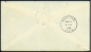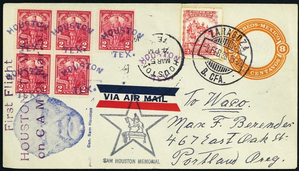 [Texas] Houston, "HOUSTON/TEX." in blue, five Very Fine strikes tie five Vermont Sesquicentennial commemoratives on a cover originating in Zaragoza, Mexico on Feb 9, 1928 and flown on C.A.M. 21 First Flight from Houston to Waco, May 5, 1928, with a 3-line C.A.M. handstamp, and strikes of the "Sam Houston Memorial" Star in gray (LD 530) and the image of Sam Houston (LD 562) in gray-blue, Very Fine. An exceedingly rare, perhaps unique, usage. Loso-deWindt 561.