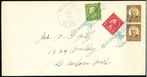 [West Virginia] Blue Jay, large Blue Jay in light blue, two nice strikes, with a Jul 27, 1934 c.d.s. alongside, ties a 6¢ postage on a slightly larger cover to Dearborn, Mich., Very Fine. 12 days later than Loso & deWindt's last recorded usage.