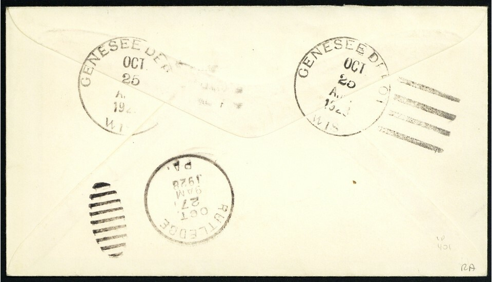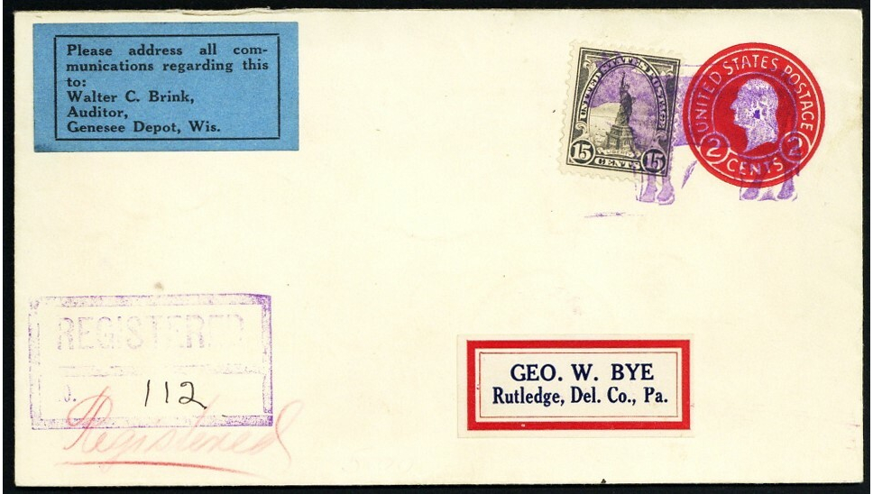 [Wisconsin] Genesee Depot, large Cow silhouette in purple, Very Fine strike ties a 15¢ Statue of Liberty on a 2¢ entire sent Registered on Oct 25, 1928 from the cancel's designer, Walter C. Brink, to Rutledge, Pa., Very Fine. Included is the original handwritten note from Brink, in part, "Hope the PM cancelled them ok. Don't know how long he will be able to use this design.".