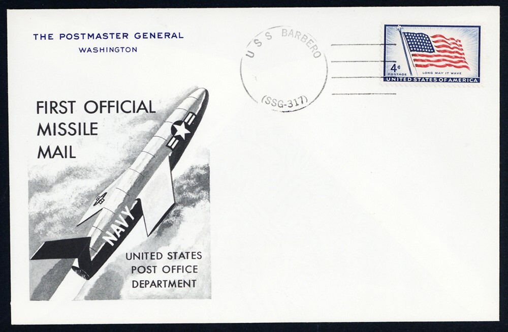 FIRST OFFICIAL MISSILE MAIL: 1959, pre-printed Postmaster General publicity cover from the U.S.S. Barbero, franked by 4c dark blue and deep carmine, tied by official cachet without date, this cover is one of 100 prepared for distribution to the Press with appropriate text on reverse.